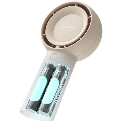 Jisulife FA43 is the latest powerful handheld fan equipped with patented 2 vortex technology, Air Turbo, and Air Jet. It is capable of producing the most powerful air of all handheld fans because the airflow is accelerated and compressed by the air duct turbine and forced out. It is designed with 5 gears, to produce strong wind from low-speed 3300r/m) to high-speed 6100r/m. It comes with two 2000mAh rechargeable batteries that take just 3 hours to fully recharge and can run for 3 to 16 hours. Can easily charge via a power bank, computer, or any other device with a USB port. The bottom of this fan comes with a lanyard and an anti-slip pad so you can hang it around your arm as a portable fan when you’re out and use it as a small desk fan on a flat surface when you’re indoors.